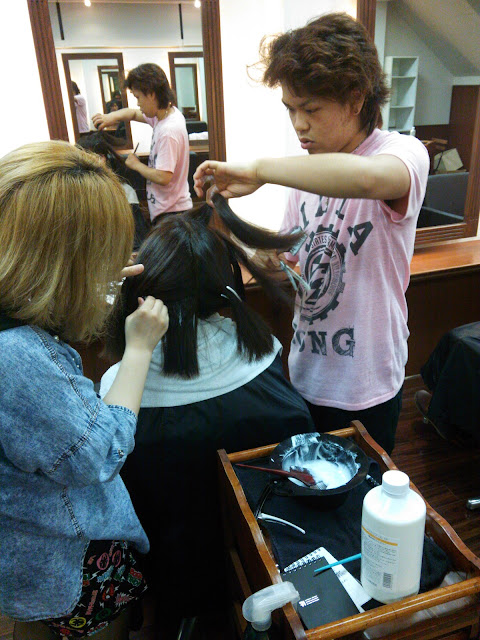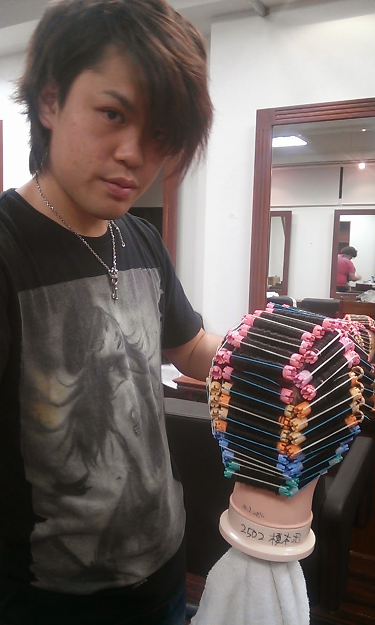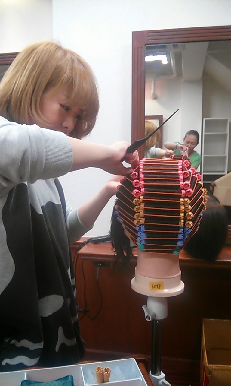 午後からは泉マネージャー、白川さん、薄野の3人がモデルになり、実際にカラーの塗布、カラーシャンプーの練習、そのあとに縮毛矯正の1液塗布をトリートメントで練習をし、モデルを使って、アイロンの練習をさせて頂きました。