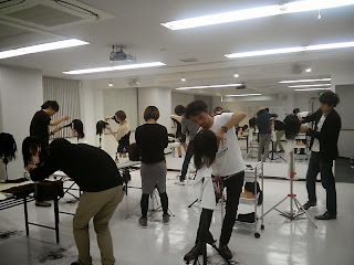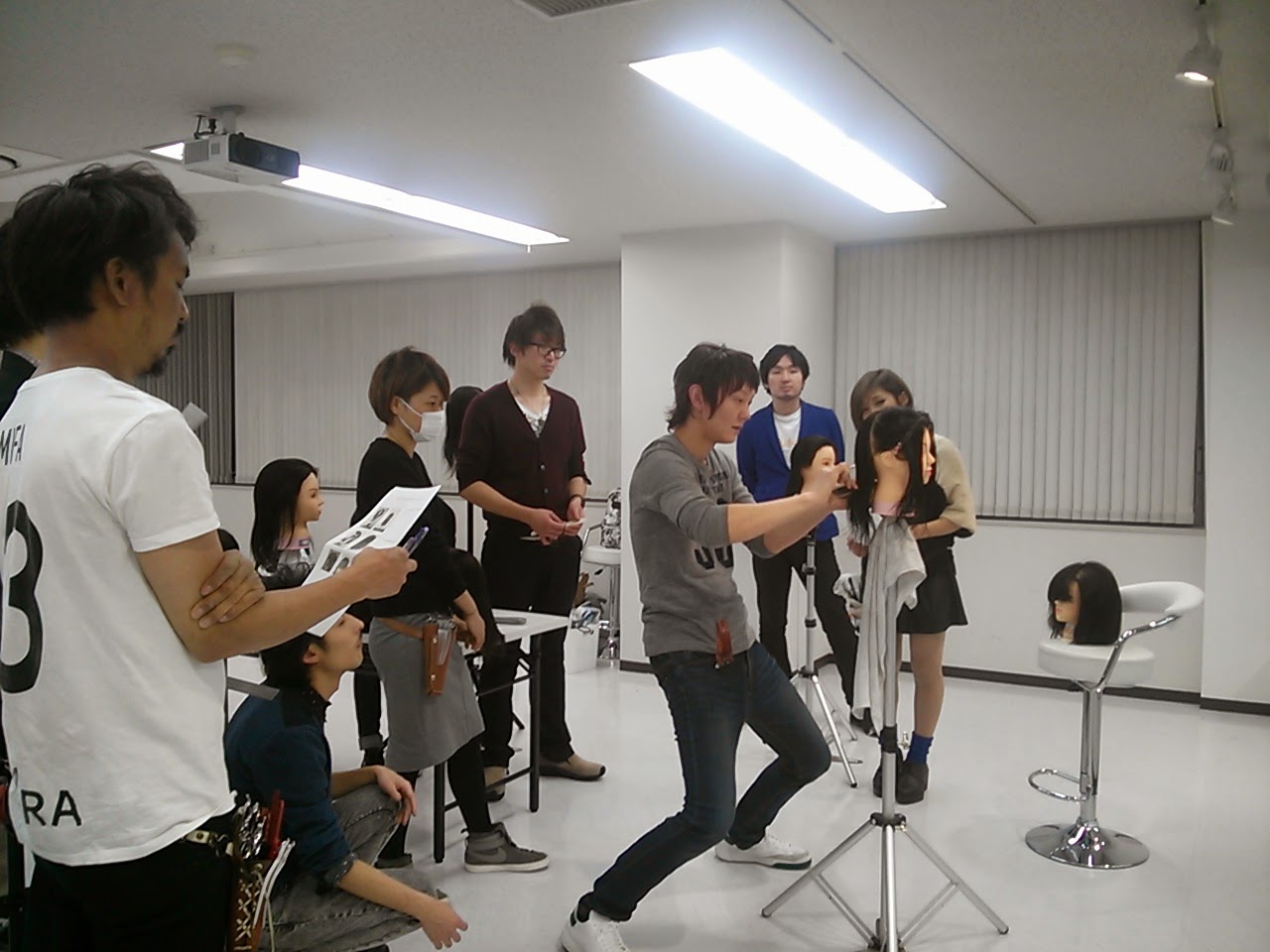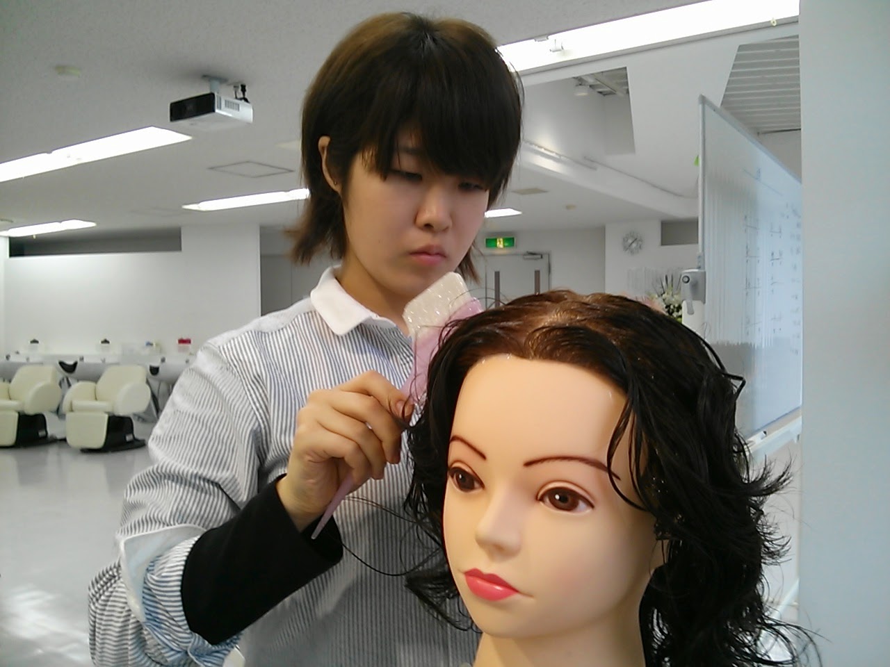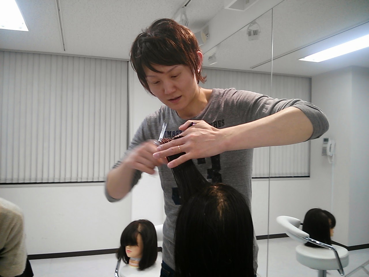 新人社員を迎えるにあたってクリエイティブでは、役職が担当の新人スタッフの練習用ウィックを作成します。 スタイルをカットするのは簡単なことですが、トップの長さ15センチ、バックの長さ台下5センチ、とか・・・ 色んな条件のある練習ウィックのカットは定規持参で何度も何度もカットして作成します。しかも、カット終了後 同じロッドで同じパーマの強さとなると更に難しいことです。 すべての役職の愛のこもった新人練習用のウィッ クは只今、グレイカラー塗布の練習で使用しています。 18日のカラーテストを目標に役職の想いが込められた ウィックで合格目指して頑張っています! 役職の皆様、遅くまで有難うございました。 IZUMI