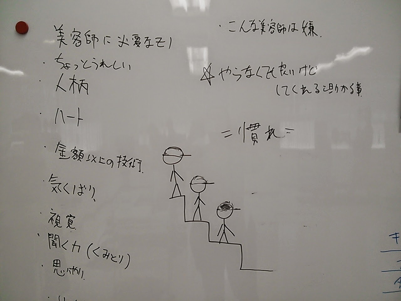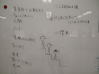コミニュケーション/ビジネスセミナー 2015/5/11 未分類 本日は喜多見店、土田チーフのセミナーでした☆ ホワイトボードに書かれたのは???こんな感じ! 朝からスタジオには笑い声が聞こえてきます。 今週から各役職によるビジネス/コミニュケーションのセミナーが開催されます☆ 土田チーフ朝早くからお疲れ様でした。。。